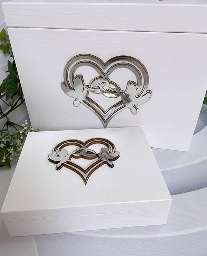 Na boku pudełka przestrzenny dekor połączonych gołąbków w sercu w kolorze byłszczącym - lustrzane złoto lub srebro