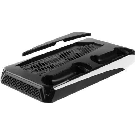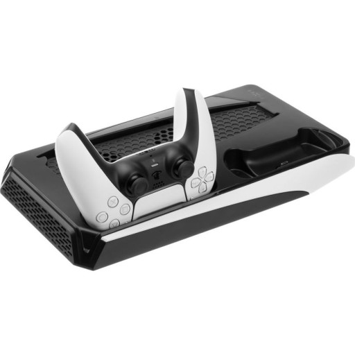 Zawiera unikalną kombinację ładowarki do dwóch kontrolerów DualSense PS5, podstawki chłodzącej z dwoma wentylatorami do chłodzenia samej konsoli oraz uchwytu na maksymalnie 12 gier na konsoli.