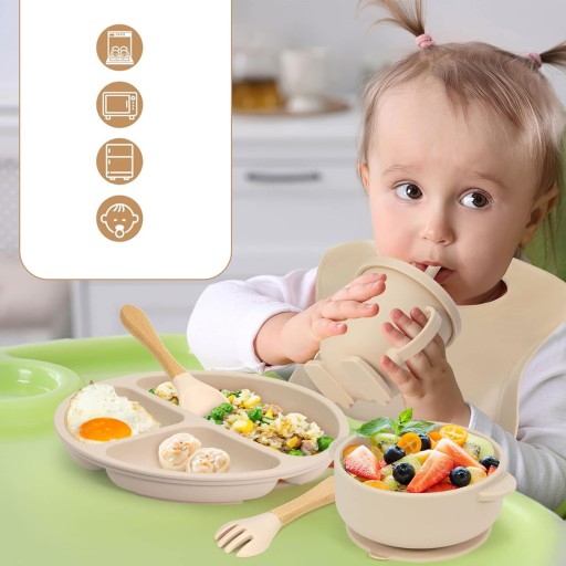 - Zawiera silikonowe widelce, silikonowe łyżki, silikonowe naczynia dla niemowląt z pokrywkami, silikonowe śliniaki, silikonowe miski i silikonowe kubki do picia. Każdy element wykonany jest z wysokiej jakości silikonu przeznaczonego do kontaktu z żywnością i nie zawiera BPA.