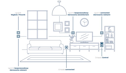 Elementy systemu wchodzą w skład zestawów startowych i rozszerzających, a do funkcjonowania systemu niezbędne jest podstawowe gniazdo Control. Łatwe w montażu gniazdo zapewnia lokalną lub zdalną kontrolę nad funkcjami domu dzięki aplikacji lub asystentowi głosowemu (Siri, Google Assistant). Ponadto gniazdo Control wspiera rozbudowę systemu, pozwalając na wzbogacenie go w dowolnym momencie o dodatkowe funkcje. Dzięki łatwej instalacji montaż i wymiana kolejnych elementów są bezproblemowe, a szeroki wybór skalowalnych rozwiązań z bogatej oferty pozwala na dobranie wyposażenia do indywidualnych potrzeb. Dodawanie do systemu przewodowych elementów connected nie wymaga wymiany instalacji, a same elementy komunikują się przez sieć Internet. Dostępne zestawy do instalacji bezprzewodowej łączą elastyczność montażu bez konieczności doprowadzania kabli z wygodą sterowania funkcjami domu z dowolnie wybranego miejsca.
