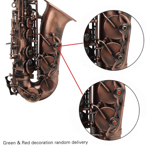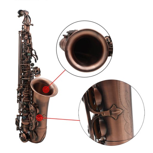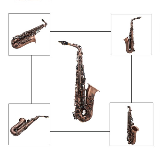 Ten saksofon altowy z płaskim zgięciem nadaje się do profesjonalnego saksofonisty. Wykonane z wysokiej jakości czerwonego brązu, z antykami z rzeźbioną powierzchnią i przyciskami muszli abalone