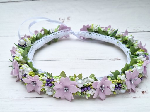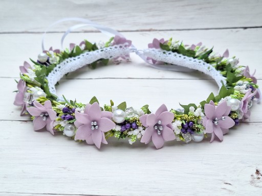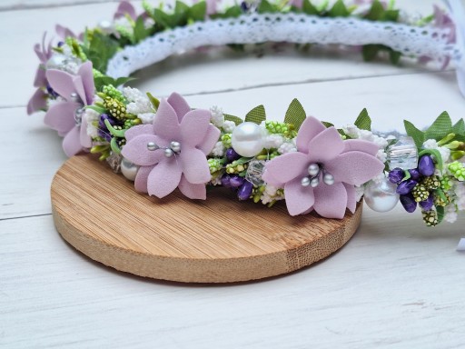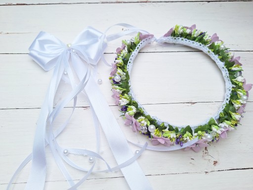 Wianek wykonany jest w rozmiarze 52cm-/+ 1cm (regulowany za pomocą wstążeczki do wybranego rozmiaru). Elastyczny stelaż sprawia, że wianek ładnie dopasowuje się do głowy.
