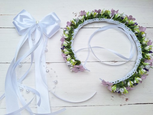 Wianek wykonany jest z różyczek piankowych i własnoręcznie wykonanych kwiatów oraz perełek z diamencikami i dodatków florystycznych. Kwiaty wyglądają bardzo realistycznie sprawiając, że dziewczynka będzie wyglądała delikatnie i elegancko w dniu Komunii Świętej.