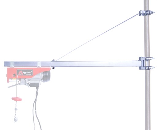 Wysięgnik marki MAGNUM przeznaczony jest do podwieszania wciągarek linowych na rusztowaniach lub innch konstrukcjach rurowych. Znajdzie zastosowanie wszędzie tam, gdzie transport pionowy wykonywany jest przy użyciu wciągarek elektrycznych. Zastosowanie ramienia znacząco poprawia komfort pracy z wciągarką oraz zwiększa bezpieczeństwo. Ramię jest wychylne w zakresie 180° i ułatwia operowanie podnoszonym ładunkiem, zwłaszcza po podniesieniu na pożądaną wysokość.