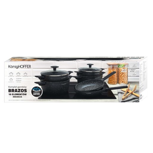 Zestaw garnków Konighoffer Bezos 10 elementów wykorzystuje powłokę non-stick ułatwiającą pielęgnację (nie do zmywarki, tylko mycie ręczne). Komplet jest solidny i pozwala na bezpieczne gotowanie oraz smażenie, zmniejszając ryzyko oparzenia dłoni. W zestawie znajdziesz naczynia o pojemności od 1,2 do 6,5 litra. Do garnków dołączono szklane pokrywki ze stalowym rantem, chroniącym przed wyszczerbieniem. Mają one również stylowe uchwyty soft touch, które się nie nagrzewają i nie ślizgają w dłoni. Z kompletem garnków i 2 patelni Bezos możesz gotować na każdym typie kuchenki. Elegancji dodaje mu marmurowa powłoka nieprzywierająca, która wytrzyma wiele cykli ścierania (5000!) oraz wykończenie aluminiowych korpusów kutych w wysokiej temperaturze. Nagrzewają się szybko, a więc oszczędzisz czas i energię. Świetnie sprawdzą się w rodzinnej kuchni lub jako prezent. Są też dobrze zabezpieczone przed wysoką temperaturą i równomiernie przewodzą ciepło. Zapewniają pewny chwyt podczas przenoszenia. O ich bezpieczeństwie użytkowania oraz nietoksycznej konstrukcji dla środowiska stanowi oznaczenie PFOA Free.