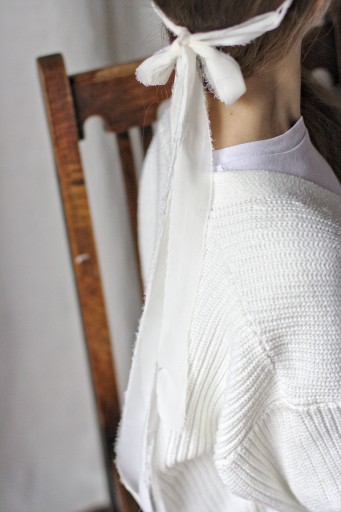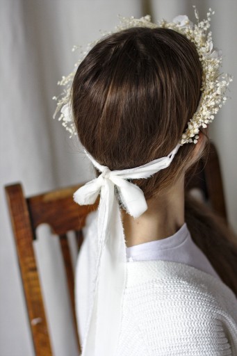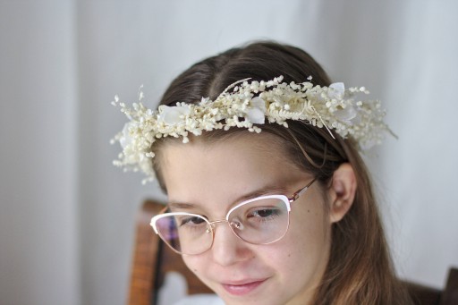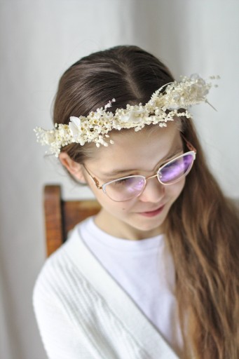 Wianek wypleciony z delikatnych białych i kremowych kwiatów: gliksji, hortensji, bielonych dodatków. Wykończony ręcznie wydzieranymi, szyfonowymi wstążkami w kolorze śmietany.