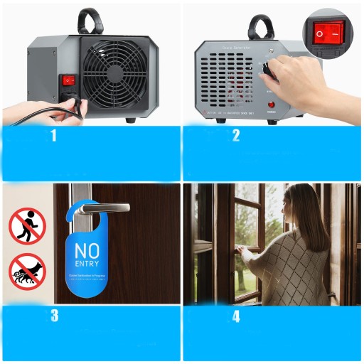 OSTRZEŻENIE: Upewnij się, że w pomieszczeniu nie ma ludzi ani zwierząt, gdy pracuje generator ozonu. Po wyłączeniu generatora ozonu należy odczekać 30-60 minut przed wejściem, a następnie otworzyć drzwi i okna w celu wentylacji.