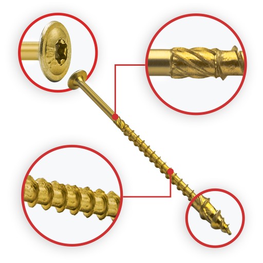 - Karby tnące - Specjalne karby tnące na gwincie przecinają włókna struktury drewna podczas wkręcania,