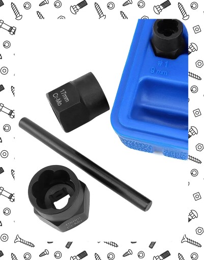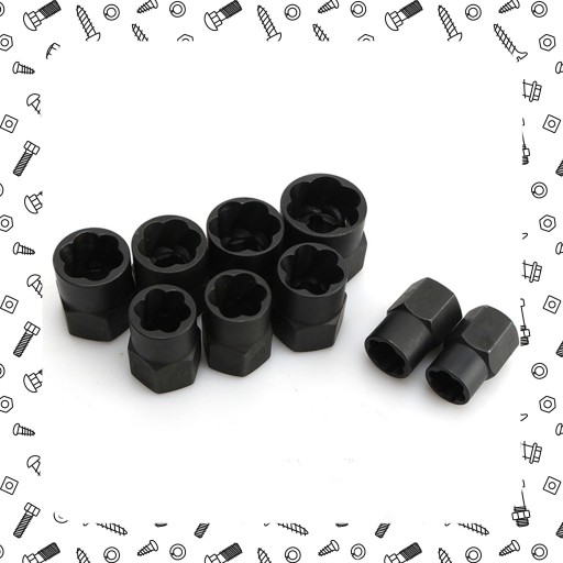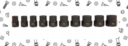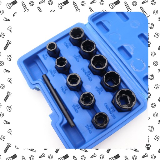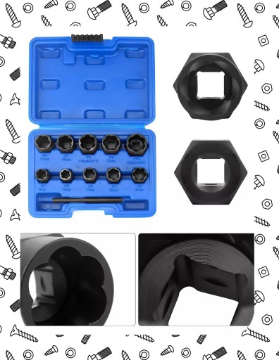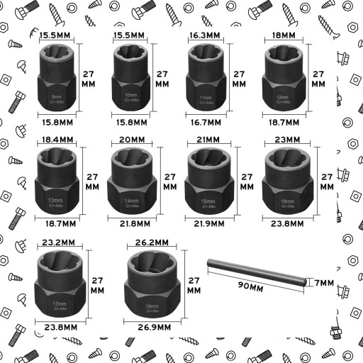 Zestaw nasadek obejmuje 11 najczęściej używanych rozmiarów, które umożliwiają skuteczne usuwanie różnych rozmiarów śrub i nakrętek: