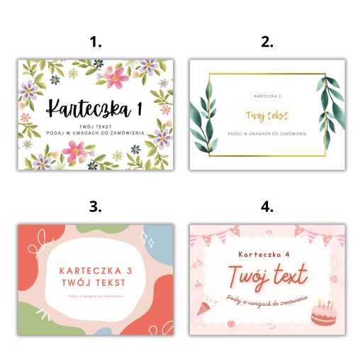 Na zdjęciu znajdziesz dostępne wzory kartek do wyboru. Podaj numer wybranej kartki w uwagach do zamówienia — my zajmiemy się resztą!