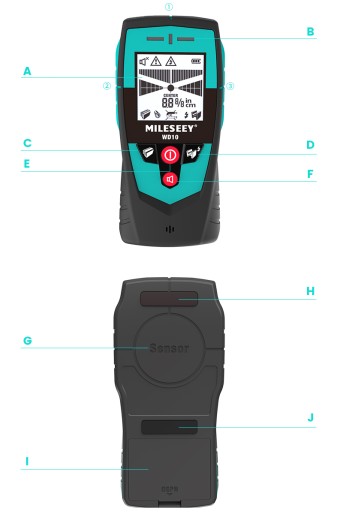 - D: sygnalizator dźwiękowy: po wykryciu poszukiwanego elementu urządzenie oprócz wskazania w formie graficznej oraz sygnalizacji świetlnej alarmuje sygnałem dźwiękowym. Istnieje możliwość wyłączenia dźwięku i pracy w trybie cichym.