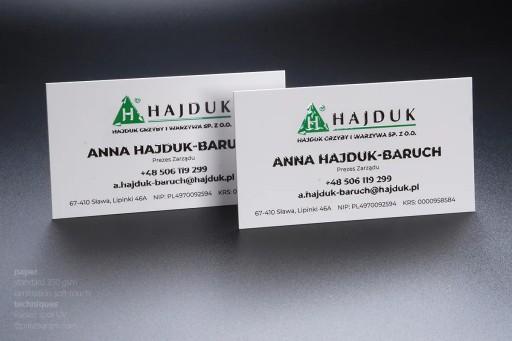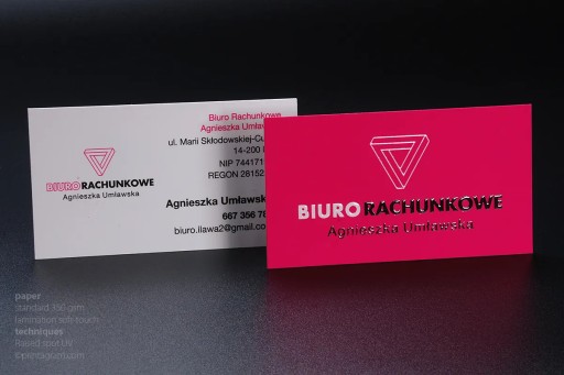 Wizytówki pełnokolorowe pokrywane laminacją soft-touch i jednostronnie lakierem UV wypukłym
