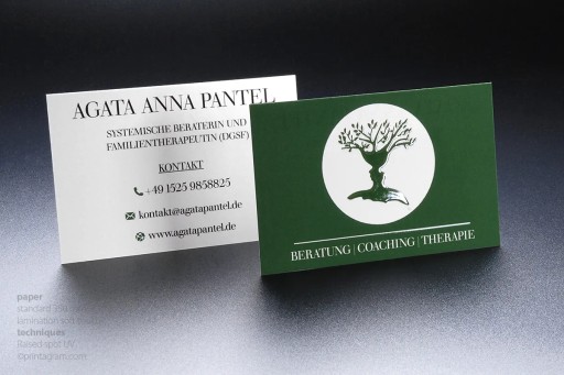 Wizytówki z efektem błyszczącej wypukłości. Dotykając taką wizytówkę ma się wrażenie zastygniętego płynnego lakieru. Wizytówki z lakierem UV wypukłym oglądane pod różnym kątem i w różnych warunkach oświetlenia odpowiadają inaczej niż płaska matowa powierzchnia wprowadzając dodatkowe “życie” do projektów.