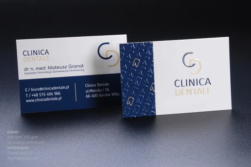Wizytówki z efektem błyszczącej wypukłości. Dotykając taką wizytówkę ma się wrażenie zastygniętego płynnego lakieru. Wizytówki z lakierem UV wypukłym oglądane pod różnym kątem i w różnych warunkach oświetlenia odpowiadają inaczej niż płaska matowa powierzchnia wprowadzając dodatkowe “życie” do projektów.