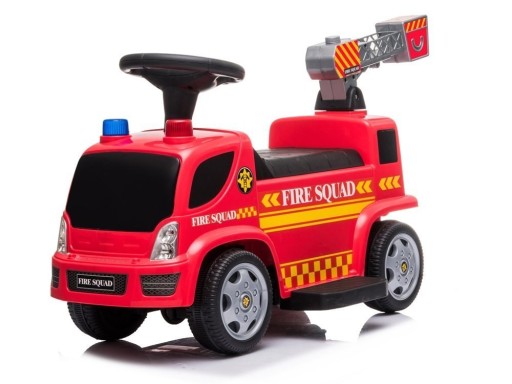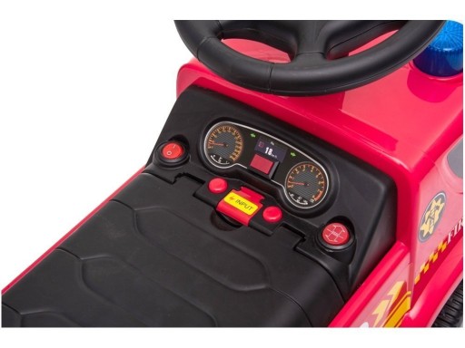 Wyglądem przypomina prawdziwą straż pożarną, dźwięki i światła zachęcą małego odkrywce do zabawy. Po podłączeniu akumulatora możemy traktować go jak prawdziwy pojazd. Podnóżki pozwolą na wygodne ułożenie nóg, a przycisk ze strzałkami umożliwi poruszanie się w przód bądź tył. Jazda równym podłożem będzie niesamowita. Jeszcze jedna dodatkowa funkcja w pojeździe zaskoczy każdego. Z tyłu jeździka znajduje się mała drabina, z której wylatują bąbelki. Wystarczy wlać płynu, nacisnąć przycisk i podziwiać jak bąbelki szybują w powietrze, które pięknie mienią się w różnych kolorach.