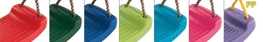 Huśtawki ogrodowe plastikowe wraz z linami o regulowanej wysokości.