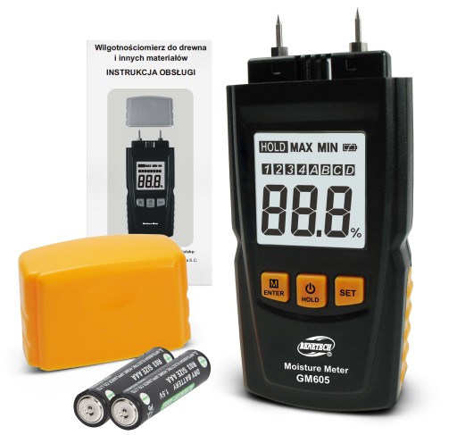 Miernik wilgotności do drewna, a także innych materiałów wykorzystujący sondy mierzące oporność do pomiaru zawartości wody. Urządzenie posiada 4 grupy do mierzenia wilgotności różnych gatunków drewna oraz 4 grupy do pomiaru wilgotności materiałów budowlanych.