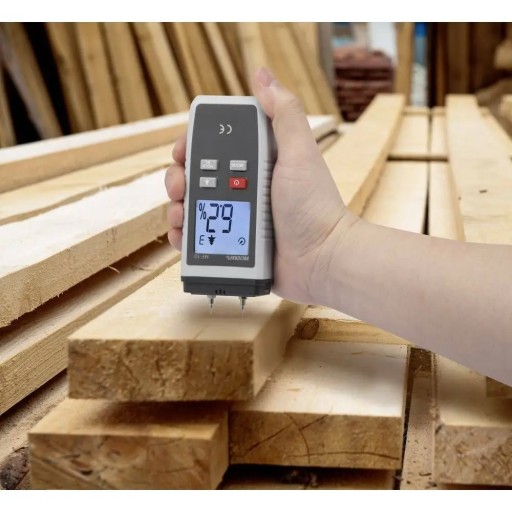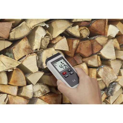 Przy pomocy kompaktowego wilgotnościomierza do materiałów można łatwo zmierzyć i określić zawartość wilgoci w różnych rodzajach drewna. Zmierzona wartość jest wyświetlana bezpośrednio na wyświetlaczu LCD.