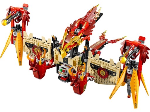 - Ognista świątynia Feniksów dysponuje podstawką z funkcją otwierania/zamykania, funkcją ładowania i wystrzeliwania bomb, 2 wieżyczkami strzeleckimi z celownikiem i miejscem na minifigurki, otwieraną bramą, zbiornikiem ognistych kul i przezroczystymi elementami imitującymi płomienie.