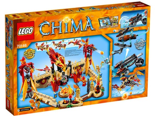 Lego Chima Świątynia ognistego feniksa 70146. Przyszedł czas na ostateczną bitwę sił ognia i lodu, wojownicze Tygrysy szablozębne atakują Ognistą świątynię potężnego plemienia Feniksów. Czy uda im się schwytać Fluminoksa, wspaniałego przywódcę Feniksów, oraz przejąć kontrolę nad całą Krainą Chima?. Feniksy przygotowały do walki z najeźdźcami zbiornik ognistych kul i całą masę rozgrzanych broni. Pomóż Flinksowi obronić świątynię z wieżyczki strzeleckiej i zasypać wrogów ognistymi bombami. Musisz działać szybko, zanim pojazd Tygrysów szablozębnych rozpruje mury świątyni swoimi potężnymi pazurami. Możesz też uruchomić tryb zasilania CHI, aby przekształcić część świątyni w wielkiego latającego Feniksa! Będzie on mógł zmierzyć się w powietrzu z wystrzeloną przez Tygrysy lotnią! Obroń niesamowitą Latającą ognistą świątynie Feniksów z serii LEGO® Legends of Chima™, która dzięki ognistemu CHI może zmienić się w latającego Feniksa zdolnego odeprzeć ataki Tygrysów szablozębnych.