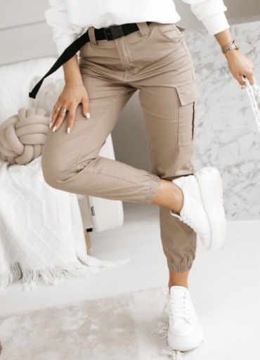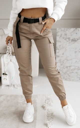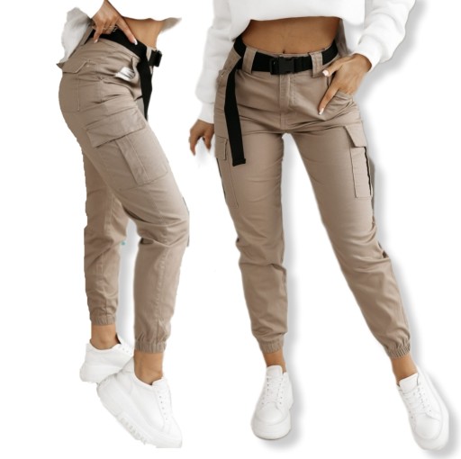 Bawełniane spodnie materiałowe z paskiem przy nogawce. Spodnie posiadają zarówno klasyczne kieszenie jak i na nogawkach, W pasie wygodna guma Ich klasyczny krój będzie idealny do wielu stylizacji, między innymi na co dzień czy do pracy. Zapinane na zamek i guzik, posiadają ściągacze na dole nogawek. Cienki elastyczny materiał, idealne na wiosnę.