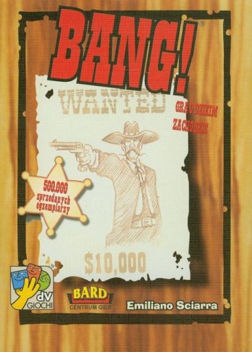 Bang! - to dynamiczna gra karciana osadzona w realiach dzikiego,nieokiełznanego zachodu. Każdy z graczy wciela się w jedną z trzech ról: stróżaprawa, bandytę lub renegata, a celem jest wyeliminowanie przeciwników.Szczególnie ważnym elementem gry jest fakt, że rola każdego z graczy jest tajnai nigdy nie wiemy kto jest przyjacielem, a kto wrogiem. Gra cechuje się bardzodużą interakcją pomiędzy graczami, prostymi zasadami i szybką rozgrywką, któranie raz może nas zaskoczyć.Zawartość pudełka:- 7 kart ról- 16 kart bohaterów- 7 skrótów zasad- 30 żetonów nabojów- 80 kart- 7 plansz graczy- instrukcja