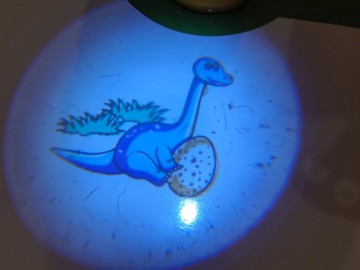Dinozaur ma wygodny włącznik, służący do zapalenia światła, które stworzy odpowiednią atmosferę do twórczych eksploracji. Po włożeniu krążka ze slajdem, obrazy zostaną wyświetlone na podstawie projektora, dając dziecku możliwość odrysowywania ich w notesiku lub tworzenia bezpośrednio na podstawie.