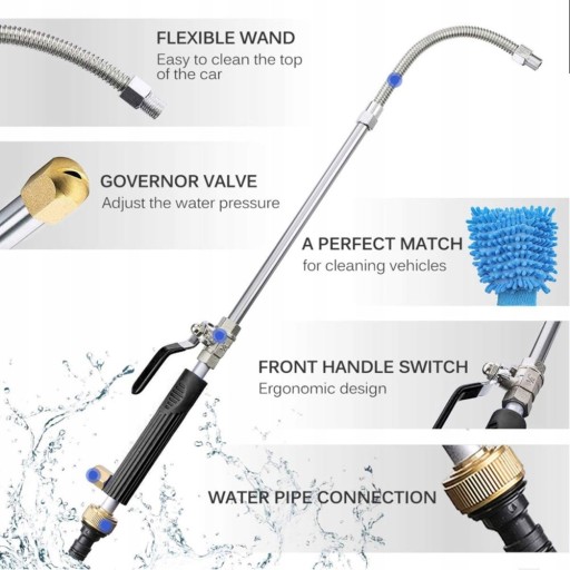 1. Z elastyczną różdżką, łatwą do czyszczenia górnej części samochodu i zaworem regulatora do regulacji ciśnienia wody, łatwy w użyciu.