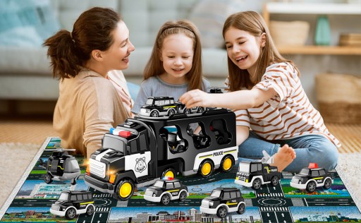 -Zaprojektowany dla entuzjastów małych policjantów, zawiera większą ciężarówkę transportową, 5 małych samochodów i 1 mały helikopter.