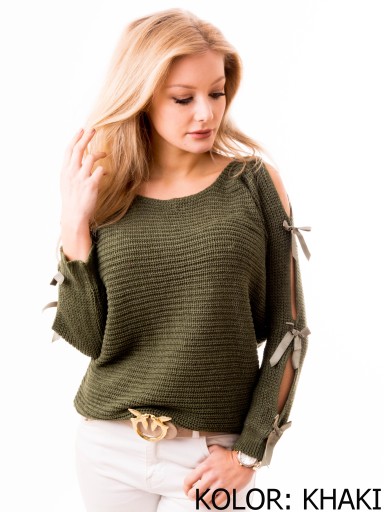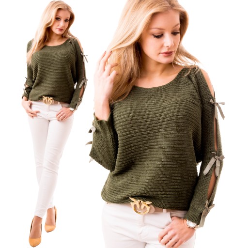 Długi rękaw, dekolt łódka, możliwość noszenia na "jedno ramię".