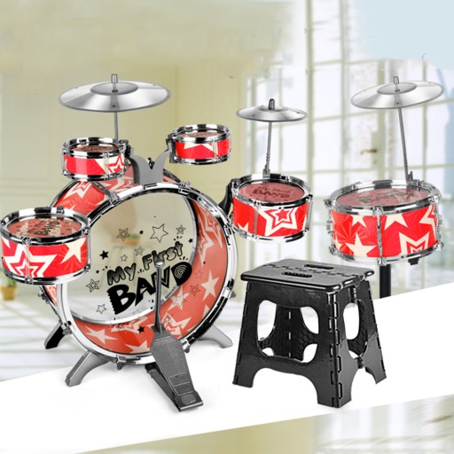 6-częściowy zestaw perkusyjny: zawiera 6 bębnów w rozmiarze małym, średnim, dużym i bardzo dużym, 3 talerze, 2 pałeczki perkusyjne, pedał i składany stołek.