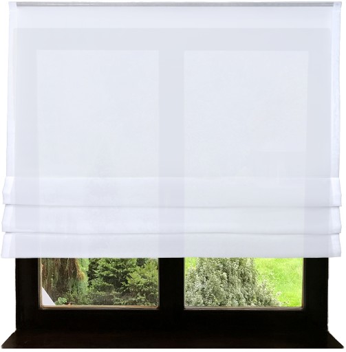 Roletka wykonana z tkaniny w kolorze śnieżnobiałym. U góry wszyta taśma 5 cm. Można przypinać żabkami lub wsuwać na tunel.