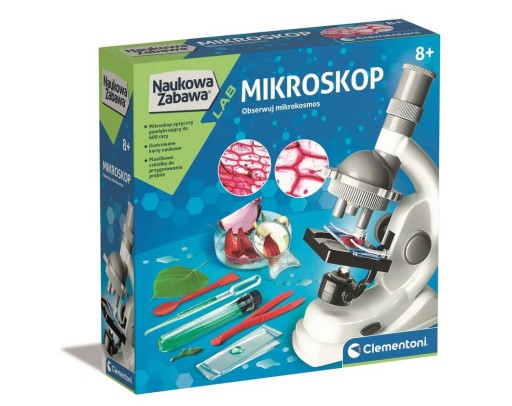 Czas na experymenty! • Prawdziwy, profesjonalny i łatwy w obsłudze mikroskop do badania mikrokosmosu w powiększeniu 600x. • Liczne eksperymenty i fantastyczne naukowe obserwacje. • Bogate wyposażenie służące do obserwowania otaczającego nas świata: plastikowe szkiełka, kubeczki, pipety, szkło powiększające i specjalne zdjęcia w powiększeniu.