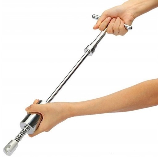 - Zaczep młotek o przyklejony adapter, chwyć młotek jedną ręką za poprzeczną końcówkę, drugą za ruchomy element na rękojeści młotka. Przesuwaj energicznie elementem ruchomym w kierunku do siebie uderzając nim o blokadę w górnej części rękojeści. W ten sposób doprowadzisz do wybicia wgniecenia.