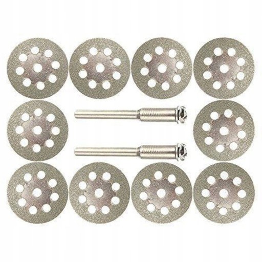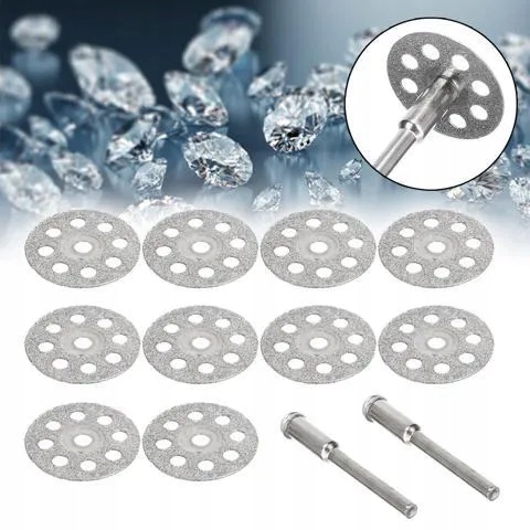 Mini tarcze diamentowe to zestaw 10 tarcz z dwoma trzpieniami, idealne do cięcia, przycinania i kształtowania różnych materiałów, takich jak glazura, kamień, szkło i tworzywo sztuczne.
