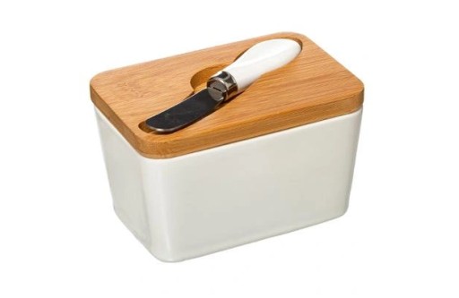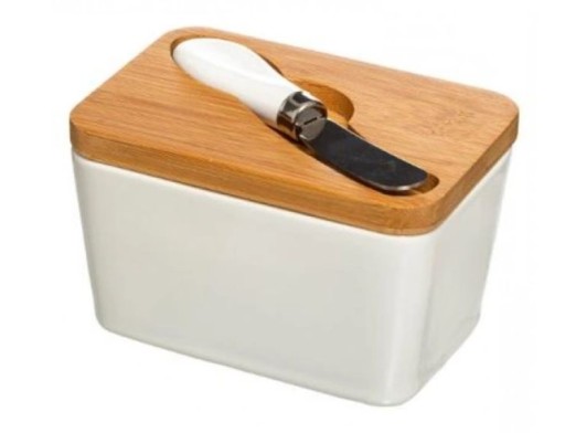 Elegancka, ceramiczna maselniczka z bambusową pokrywką i nożykiem.