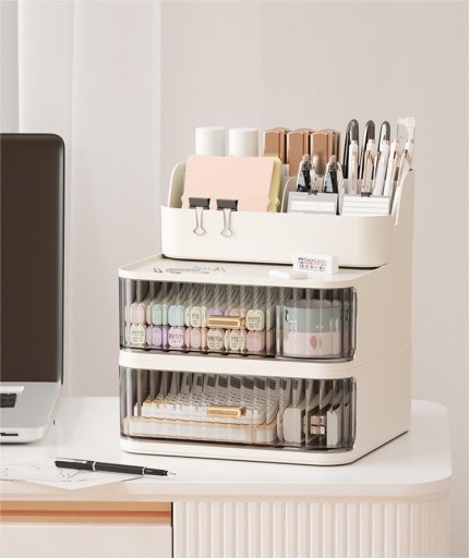 КОРОБКА-ОРГАНИЗАТОР ШКАФ ДЛЯ КОСМЕТИКИ ЩЕТКИ 2 ЯЩИКА КРЕМОВЫЙ ТЮРОМЫЙ СТОЛИК F33