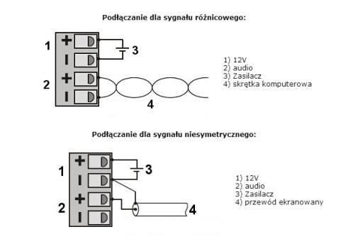 Zaletą różnicowego przesyłania dźwięku po skrętce UTP jest eliminacja zakłóceń i przydźwięku powstającego na kablu