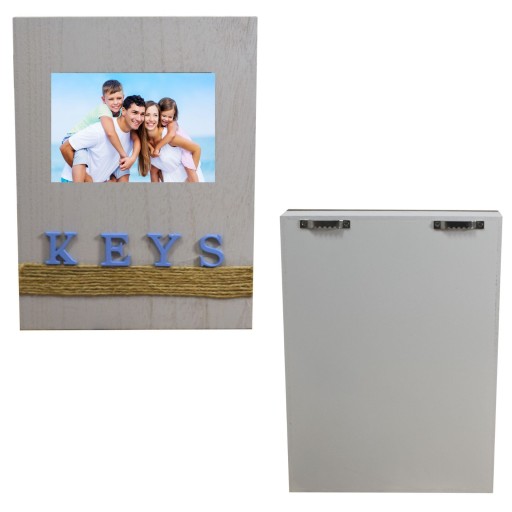 Skrzynka na klucze wykonana z wysokiej jakości drewna MDF. Wieszak na klucze w kolorze szarym posiada w środku 6 haczyków do powieszenia kluczy. Z tyłu szafki na klucze znajdują się wygodne w montażu haczyki montażowe do powieszenia na ścianie. Skrzynka na klucze nie dość, że jest pojemna i solidna, to posiada dodatkowy atut - miejsce na Twoją ulubioną fotografię!