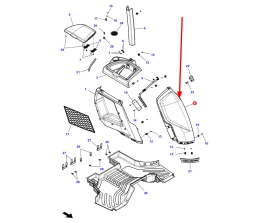Oryginalna lewa osłona błotnika wewnątrz kabiny o numerze katalogowym ACW022230C, stosowana w ciągnikach rolniczych marki Massey Ferguson.