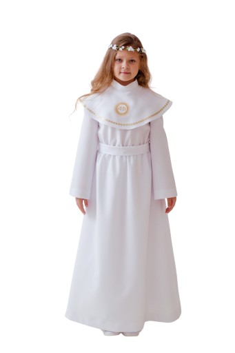 Alba komunijna odcinana w pasie, pasek wiązany z tyłu na kokardkę. Pelerynka zakładana osobno, zapinana z tyłu na guziczek. Tkanina stretch.