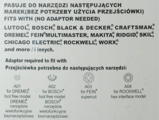 - Brzeszczot kompatybiny z narzędziami następujących marek (bez potrzeby użycia przejściówki): LUTOOL, BOSCH, BLACK & DECKER, CRAFTSMAN, DREMEL, FEIN MULTIMASTER, MAKITA, RIDGID, SKIL, CHICAGO ELECTRIC, ROZKWELL, WORX i wiele innych.