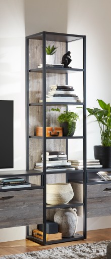 Nowoczesny design o matowym wykończeniu idealnie wpasowuje się do wnętrza w stylu loftowym. Czarne metalowe elementy dodają charakteru regałowi a otwarte boki optycznie powiększają powierzchnię użytkową. Wewnątrz zaprojektowano aż 6 wnęk dla optymalnego wykorzystania i zastosowania w każdej aranżacji. Uwieńczeniem jest oświetlenie, które idealnie podkreśli Twoje dodatki.
