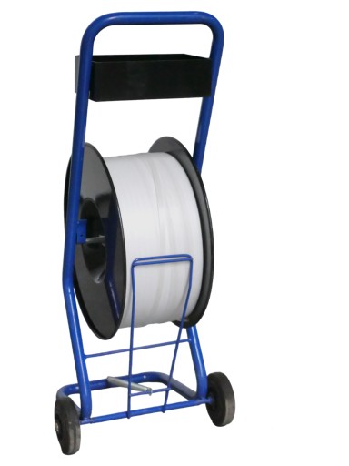 Wózek do taśm PP (Polipropylenowych). Wózek, popularnie odwijacz, jest niezbędnym urządzeniem w procesie bandowania. Zamocowana na nim taśma spinająca, jest zabezpieczona przed uszkodzeniem, dzięki dwóm metalowym kręgom które jednocześnie zapobiegają zbędnemu rozwijaniu i plątaniu się taśmy. Wózek przystosowany do taśm o średnicy 200 [mm], w kolorze niebieskim. Posiada dwa gumowe koła dzięki którym przemieszczanie jest łatwe oraz ciche. Dodatkowo posiada metalowy koszyk na zapinki, spinki i napinacz. Wózek jest również wyposażony w hamulec. Solidna metalowa konstrukcja zapewnia trwałość użytkowania.