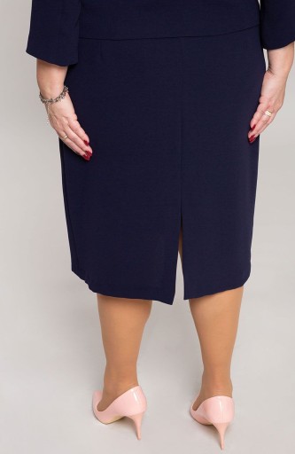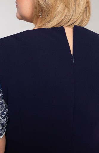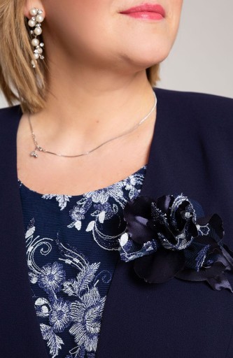 Niezwykle elegancka, klasyczna garsonka złożona z wizytowej sukienki oraz żakietu. Garsonka wykończona jest w granatowym kolorze. Uszyto ją z mięsistego materiału dobrej jakości, który nie jest elastyczny - bardzo prosimy o zwrócenie na to uwagi podczas dobierania rozmiaru produktu. Sukienka wykończona jest krótkimi, koronkowymi rękawkami oraz okrągłym dekoltem. Posiada również podszewkę. Zapinana jest na zamek znajdujący się na plecach. Z tyłu posiada również klasyczny rozporek. Sukienka posiada podłużne przeszycia, które optycznie wyszczuplają sylwetkę. Górna część produktu ozdobiona jest koronką ze zdobnym, kwiatowym motywem. Żakiet wykończony jest dekoltem w kształcie litery V oraz rękawami o długości 3/4. Na ramionach znajdują się poduszki. Produkt zapinany jest na jeden, ozdobny guzik. Oryginalności dodaje odpinana broszka w kształcie kwiatu. Podobnie jak sukienka, żakiet również posiada koronkowe zdobienie w kwiecisty wzór.