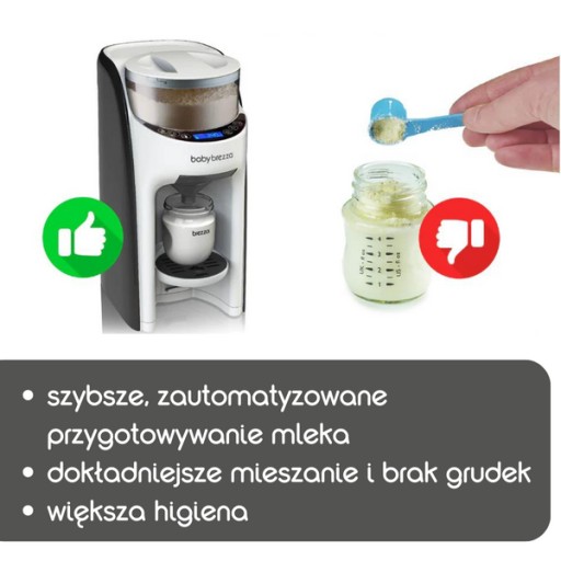 urządzenie dozuje mleko modyfikowane z hermetycznego pojemnika na proszek do lejka i miesza je z wodą w wybranej przez Ciebie temperaturze