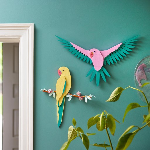 - Grafika na ścianę - użyj 644 klocków LEGO z zestawu i stwórz kolorową scenę z dwiema arami: jedną siedzącą na kwitnącej gałęzi, a drugą w locie z rozpostartymi skrzydłami