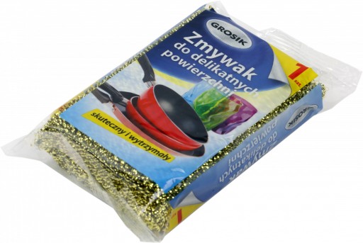 Zmywak Grosik przeznaczony do naczyń teflonowych. Nie rysuje delikatnych powierzchni. Dobra jakość wytrzymały i skuteczny.