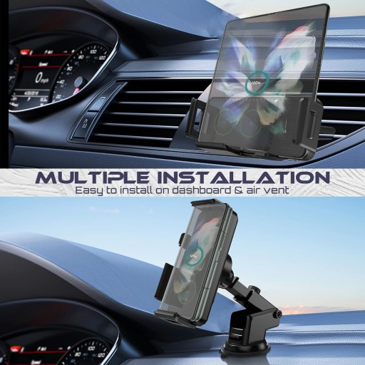 - Podwójna instalacja: Wyposażony w przyssawki i klipsy wentylacyjne, możesz przymocować uchwyt telefonu do deski rozdzielczej, otworu wentylacyjnego, a nawet okna, w razie potrzeby. Dzięki regulowanej dolnej półce można ją przesunąć do najodpowiedniejszej pozycji w zależności od modelu telefonu, aby ustawić środkową cewkę telefonu w celu optymalnego ładowania.