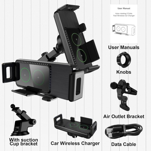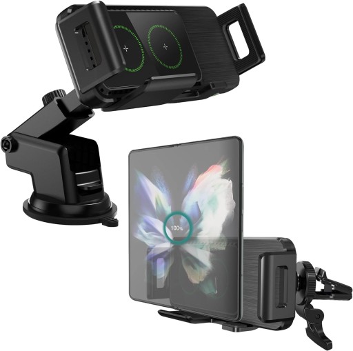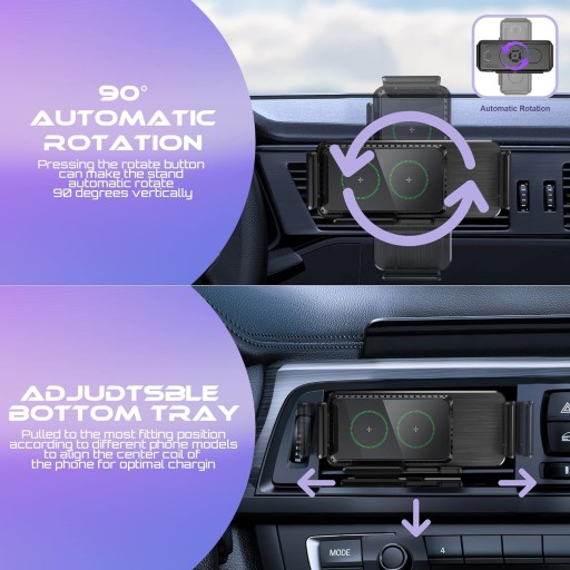 - Bezprzewodowa szybka ładowarka samochodowa Qi: Zasilana dwiema cewkami ładującymi, znacznie poprawiającymi wydajność ładowania. Obsługa szybkiego bezprzewodowego ładowania o mocy maksymalnie 15 W, kompatybilna z iPhonem 8 plus, iPhonem X, iPhonem 11/12, serią Samsung S8/S9/S10; Samsung W21 5G, Samsung Galaxy Fold/Złóż 2/Złóż 3/Złóż 4, Galaxy Z Flip 5G/Flip 3/Flip 4, Note 20 Ultra. Wszystkie telefony komórkowe o przekątnej 5,5–8,0 cali. Uwaga: tryb szybkiego ładowania wymaga zasilacza samochodowego QC 3.0 jako źródła zasilania.